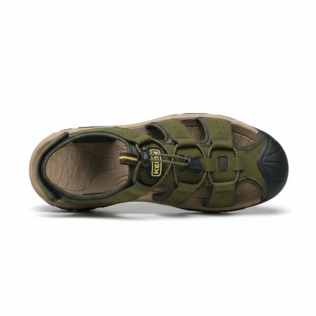 This open-toe strap sandal is made with a structured synthetic upper and layered strap design. The contoured footbed includes molded line texture to support steady placement during wear. A textured sole base provides ground contact across varied surfaces. The open construction allows airflow while maintaining a stable hold through adjustable fastening points.