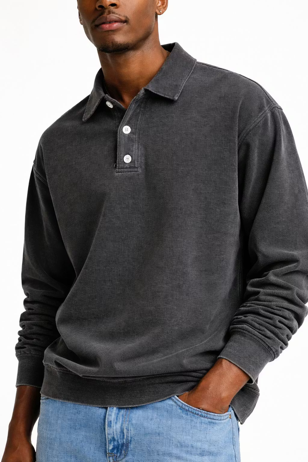 - Classic polo collar with two-button placket