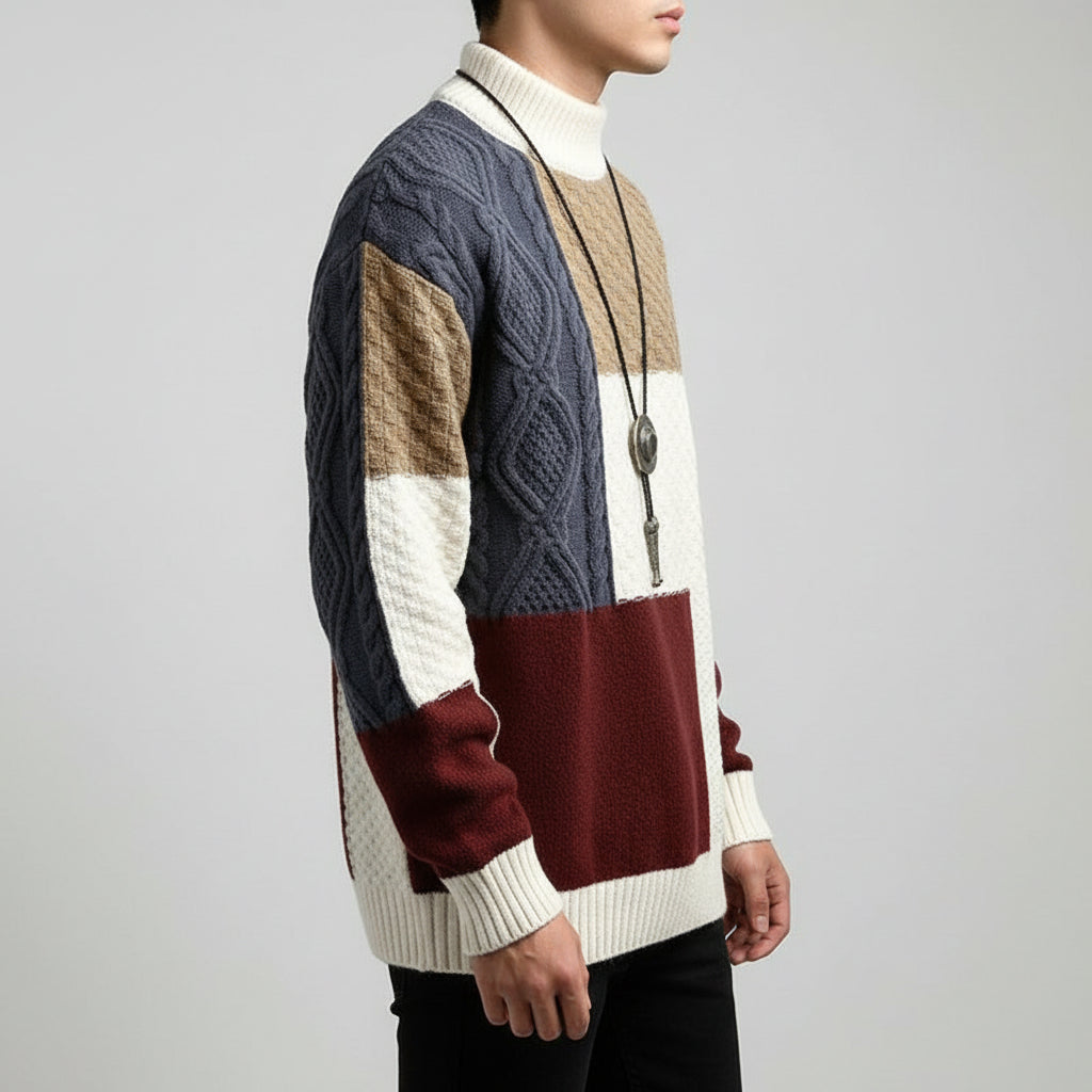 This men’s crew neck sweater is crafted from a yarn blend featuring a panel block layout with multiple knit textures across the body and sleeves. Long sleeves and ribbed trim at the neckline, cuffs, and hem create a balanced and defined silhouette. The segmented knit surface adds visual structure while remaining suitable for indoor wear and layered wardrobes. A distinctive addition to modern menswear collections and ecommerce apparel listings.