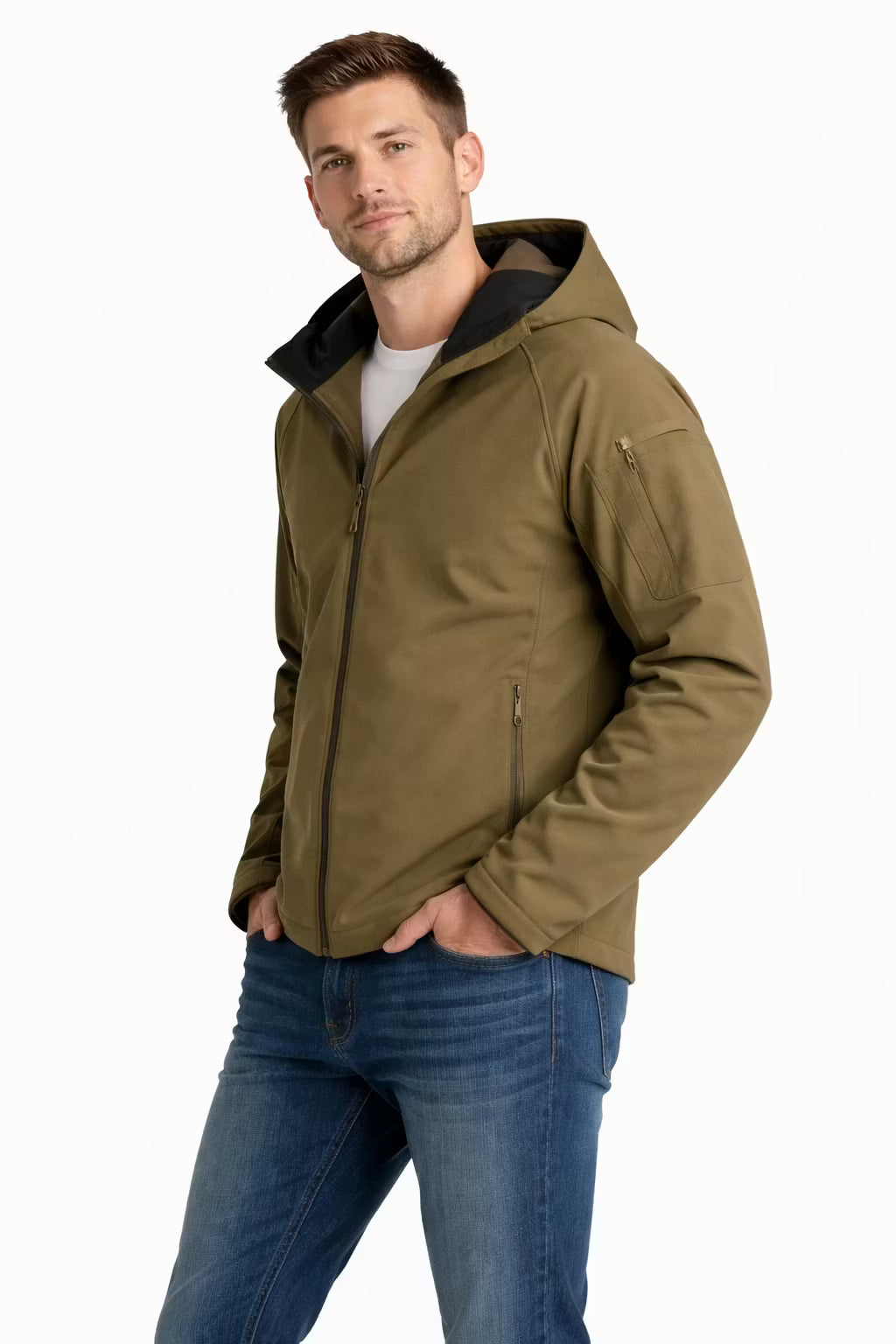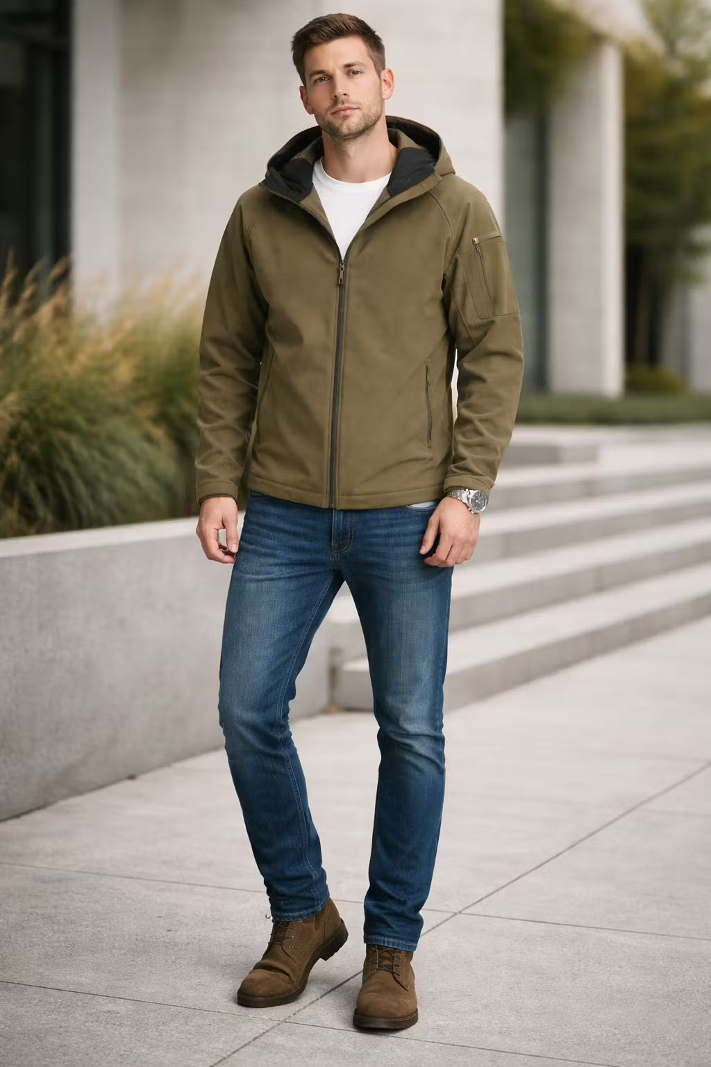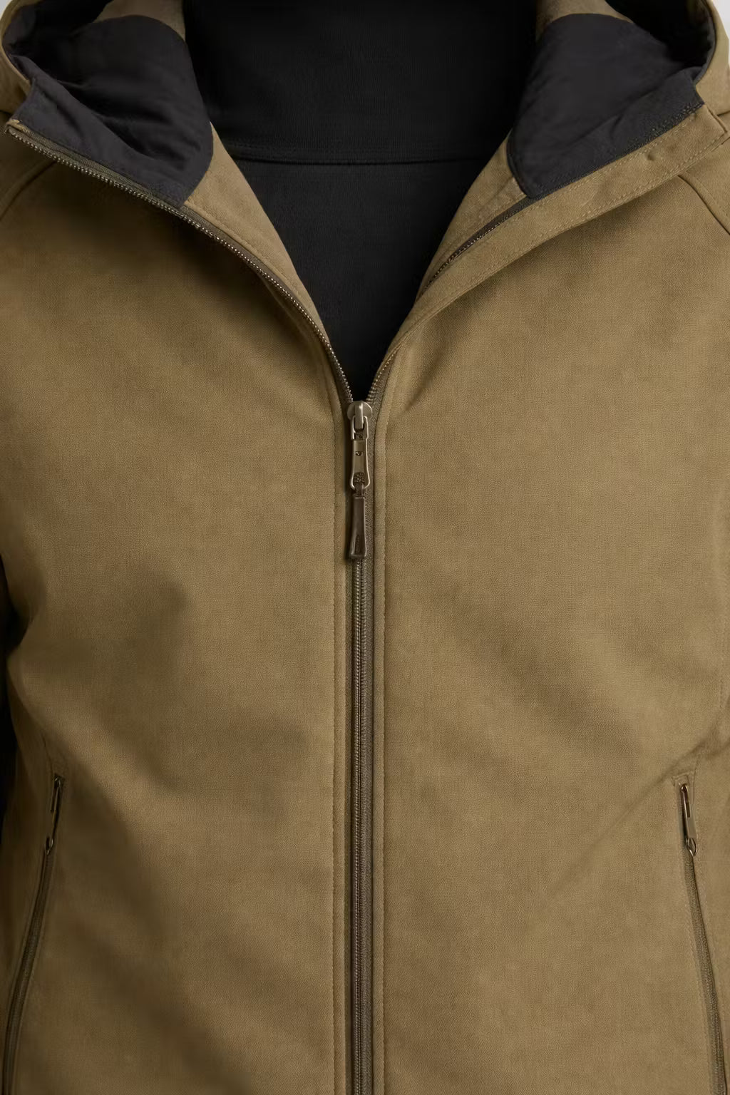 This jacket is made from woven softshell fabric with a clean and uniform surface. The zip-front closure is combined with an attached hood for added coverage. Long sleeves with straight seams create a balanced outerwear profile. The design is suitable for outdoor environments and everyday use.