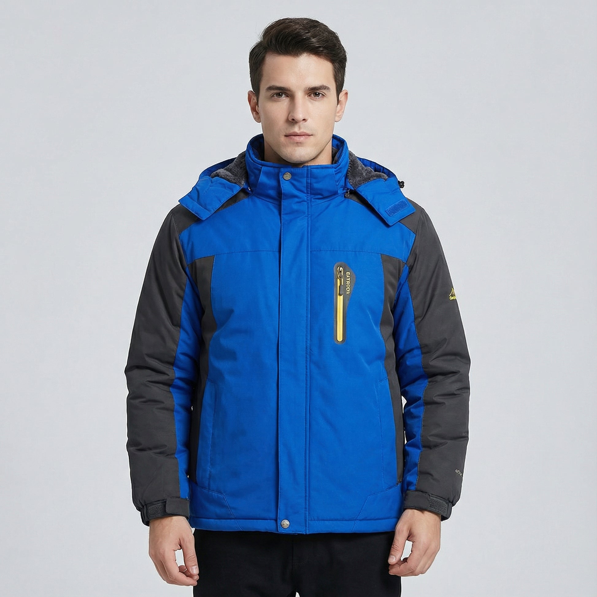 This men’s hooded zip jacket is made with a woven outer fabric and a fleece-lined interior for structured layering. The design includes contrast panel sections and a high front closure for added coverage. A full-length zipper allows adjustable styling across changing conditions. Suitable for everyday wear, travel, and outdoor settings, this jacket pairs well with denim, boots, and seasonal layers.
