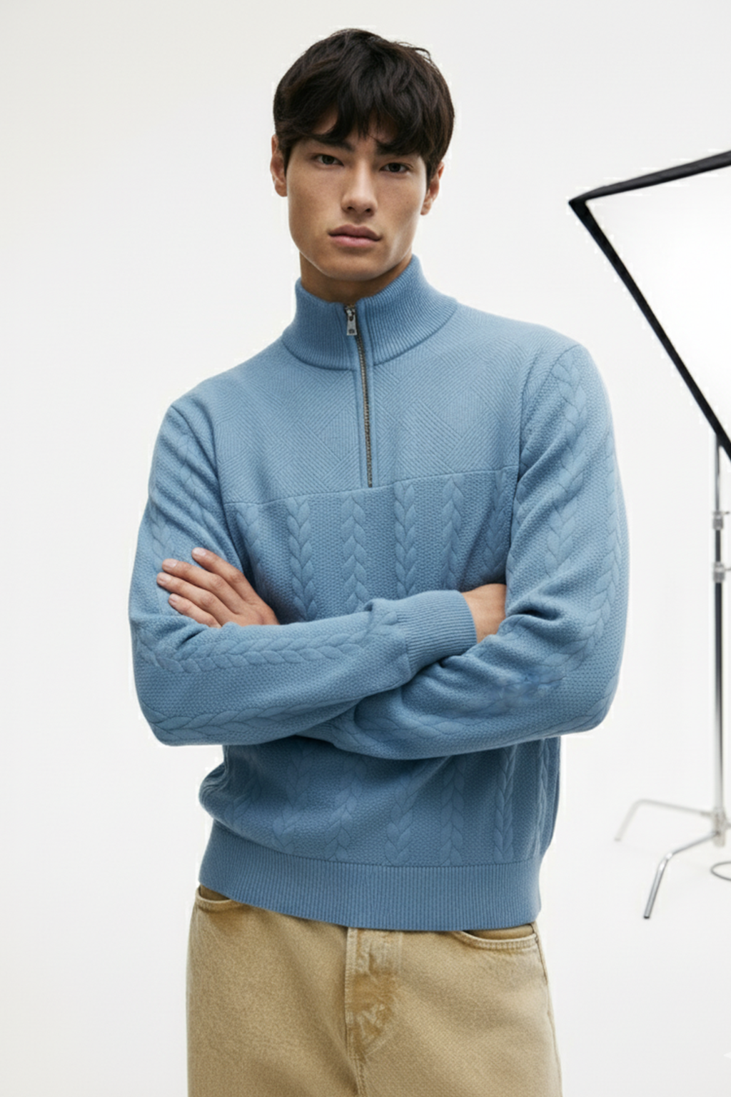 The Brandon sweatshirt makes a bold statement with its vibrant bright blue color, balanced by the timeless half-zip turtle neck design. Detailed with cable-knit accents on the front and sleeves, it blends contemporary style with classic texture. A standout piece that’s equally at home in casual or refined settings.