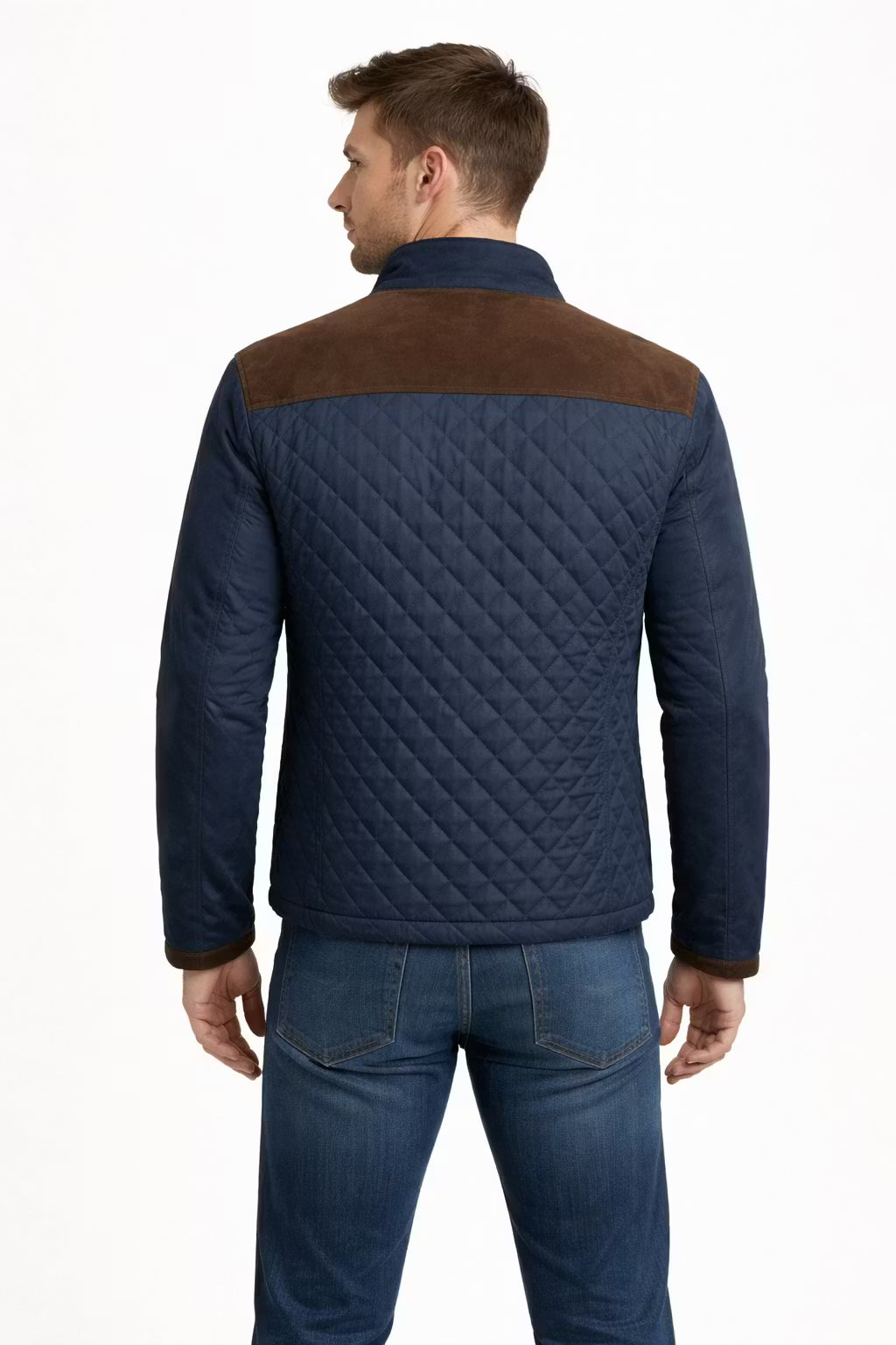This men’s quilted jacket combines a structured cotton blend body with contrast suede panels across the shoulders for a refined, dimensional finish. The diamond stitch pattern adds visual interest while maintaining a sharp silhouette suited for modern city dressing. Designed with a stand collar and button front closure, it transitions seamlessly from office environments to evening outings. Ideal for spring and fall layering, this jacket delivers confident styling for professional and smart-casual occasions across Canada.