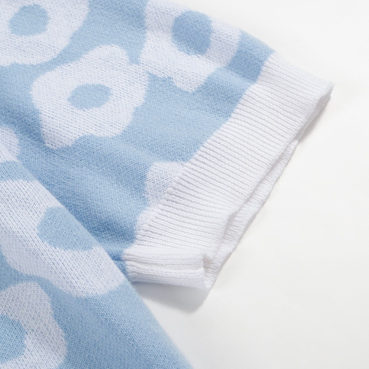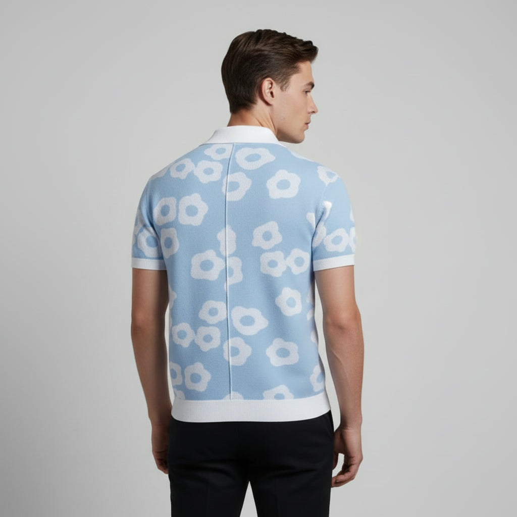 Retro Knit Floral Polo Shirt – Short Sleeve Button Front