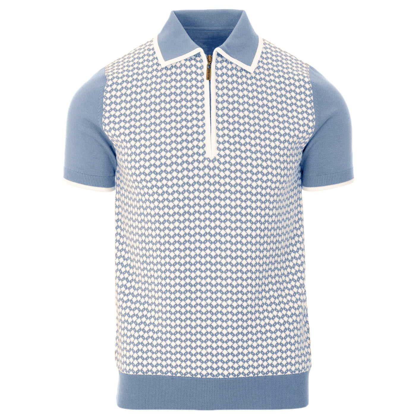 Men’s Blue Knit Short Sleeve Polo Shirt With Zip Collar And Geometric Pattern