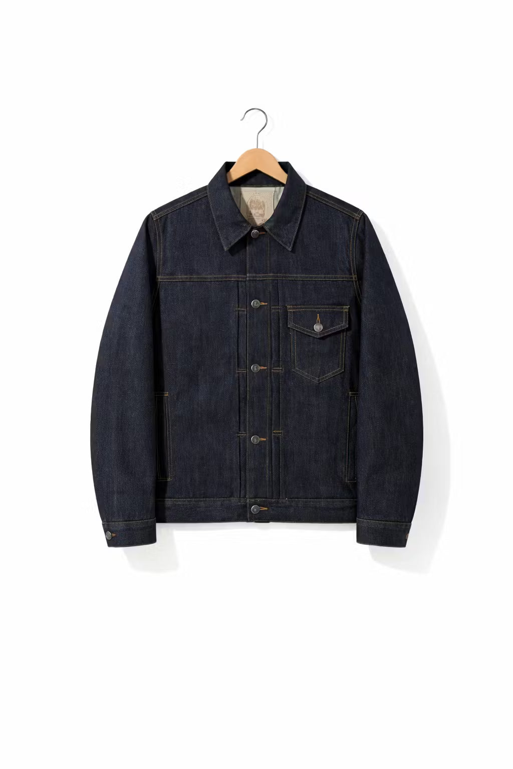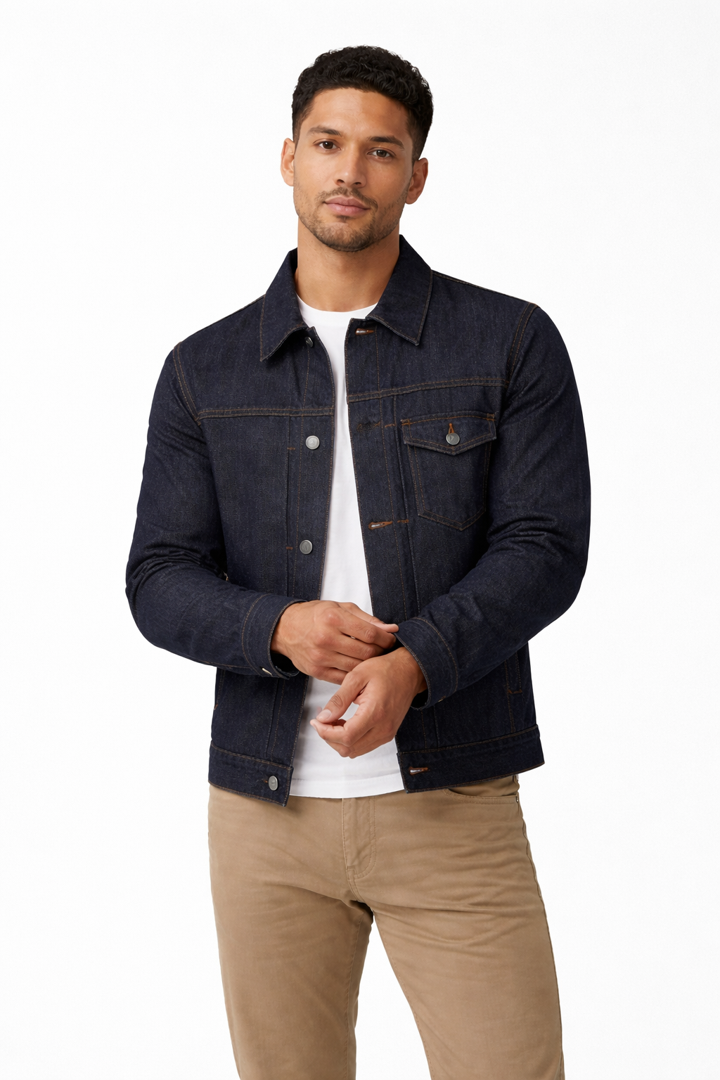 This men’s denim jacket is crafted from woven cotton raw denim with a dark indigo finish and visible contrast stitching. Designed with a button front closure and long sleeves, it pairs well with denim, workwear trousers, and street styling. The structured shape supports daily wear and city use. A clean raw denim jacket built for modern Canadian wardrobes.