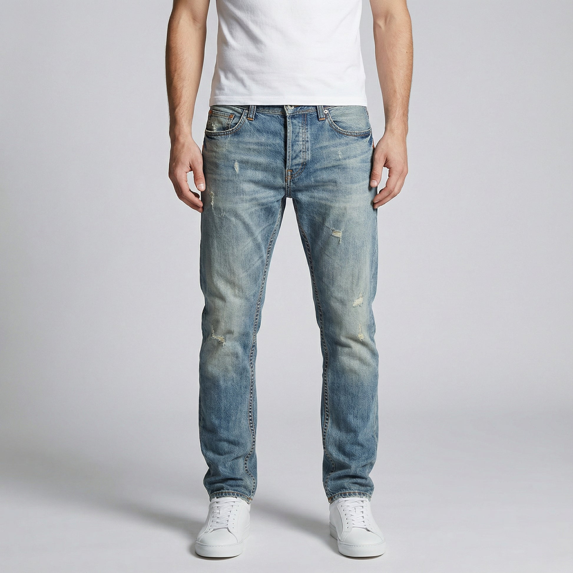 Men’s Distressed Denim Jeans With Straight Fit Button Fly And Worn Texture