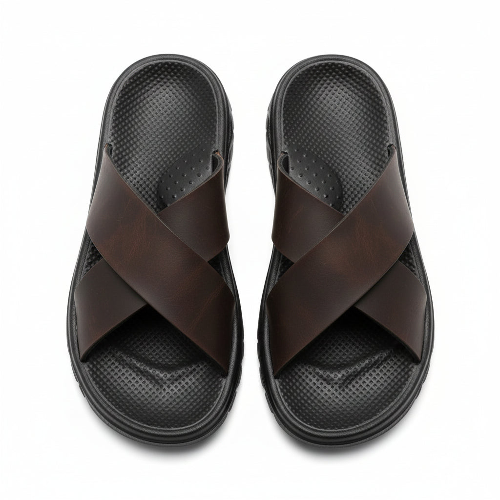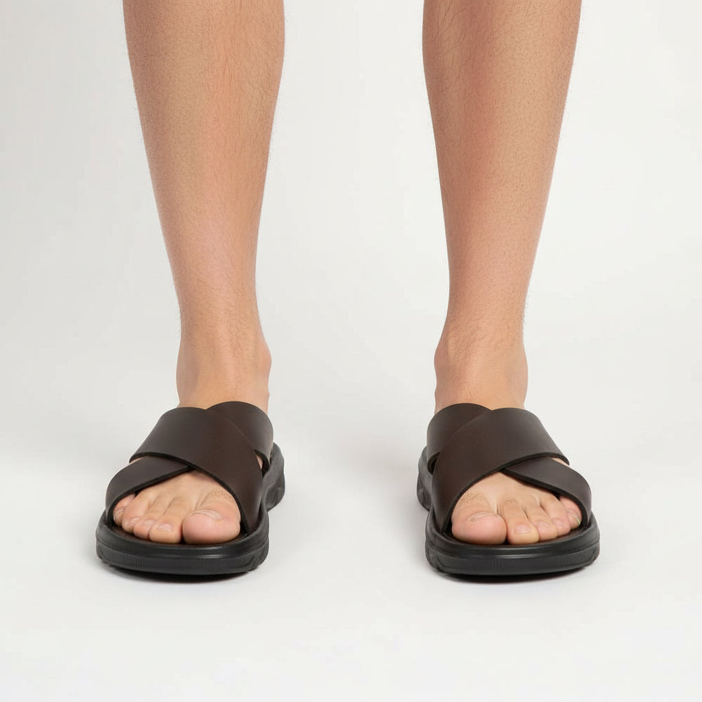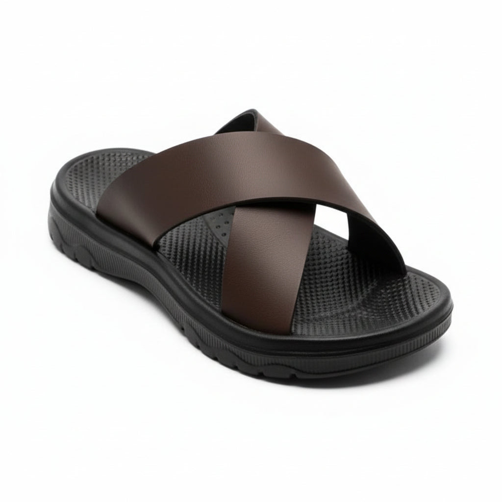 This slide sandal features a synthetic upper formed with a wide cross-band strap design. The footbed includes a molded surface texture that guides foot placement during wear. A flat sole base maintains steady contact with the ground across smooth surfaces. The open slide structure allows quick entry while keeping a defined foot position.