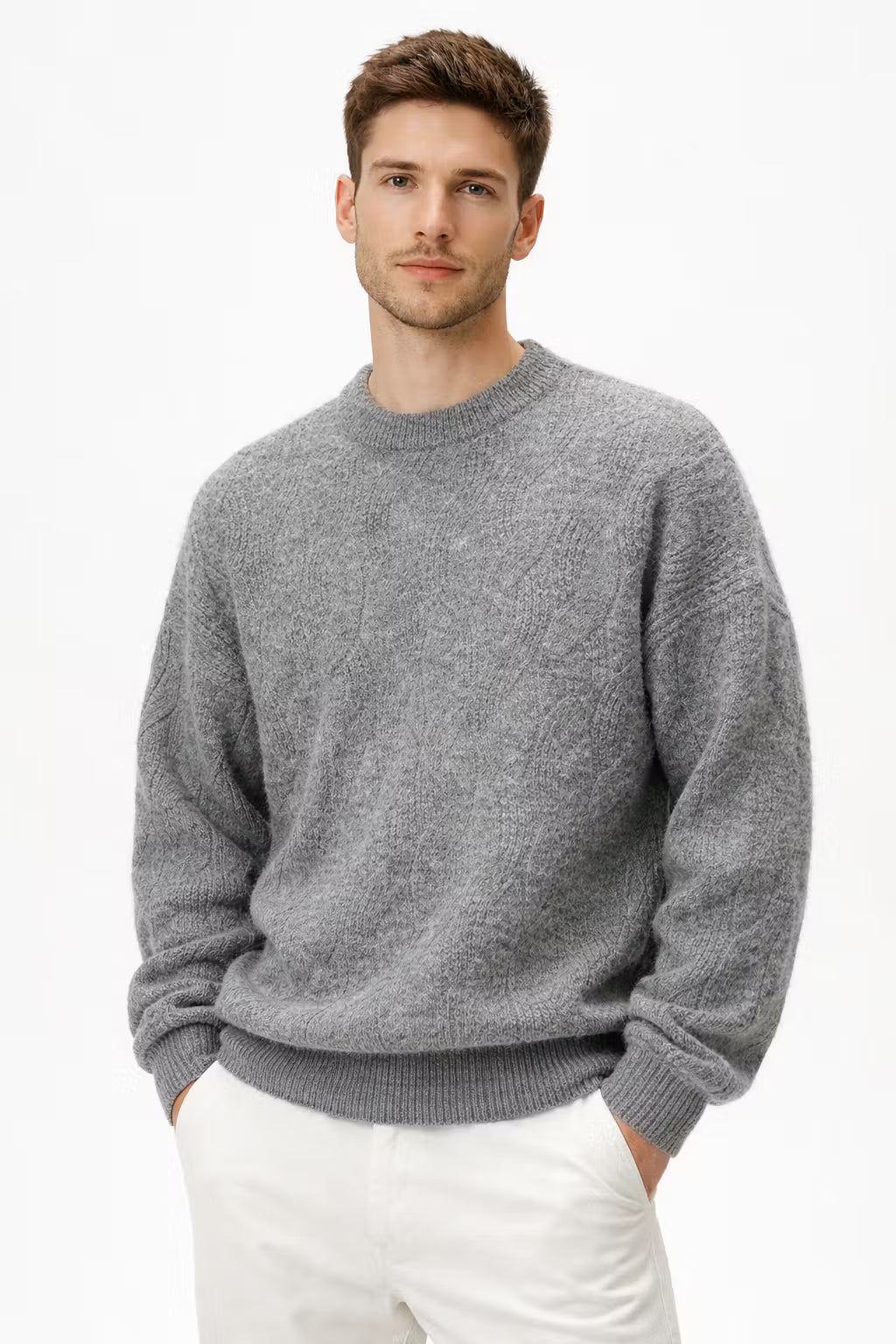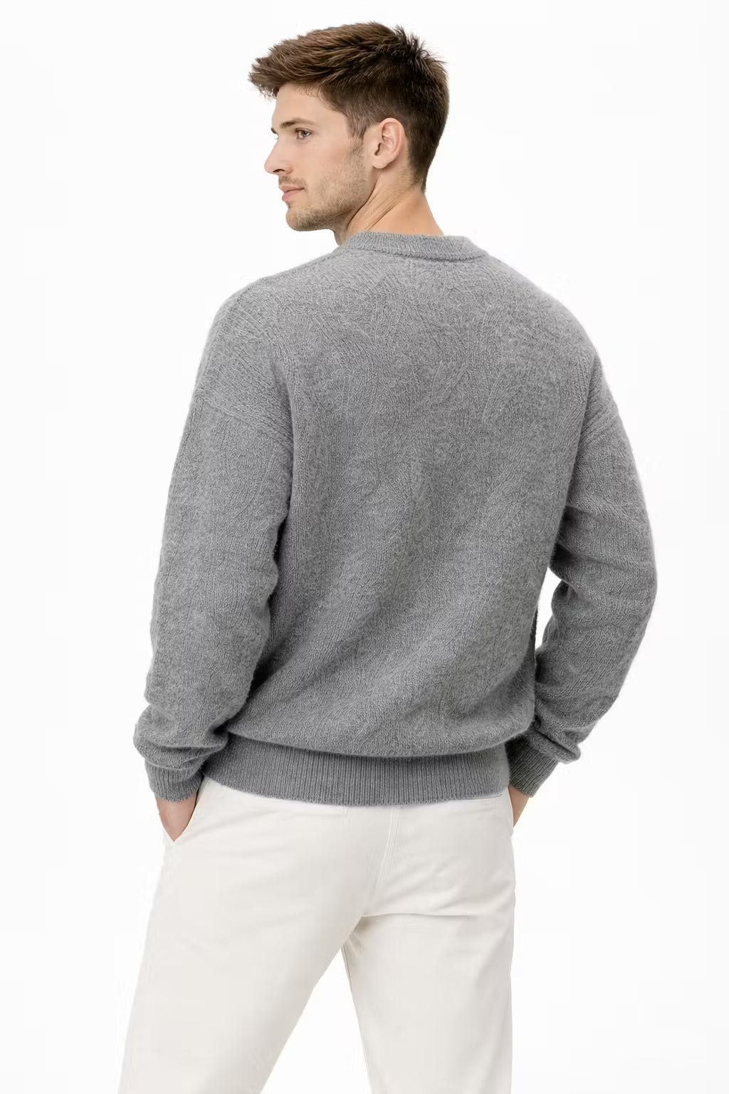 This men’s textured knit crew sweater is made with a structured yarn pattern that creates visual depth across the surface. Ribbed finishing at the neckline, cuffs, and hem helps maintain a clean silhouette. Designed for daily wear, this knit top pairs naturally with trousers or layered outer pieces. A refined option for modern wardrobes focused on texture-driven apparel.