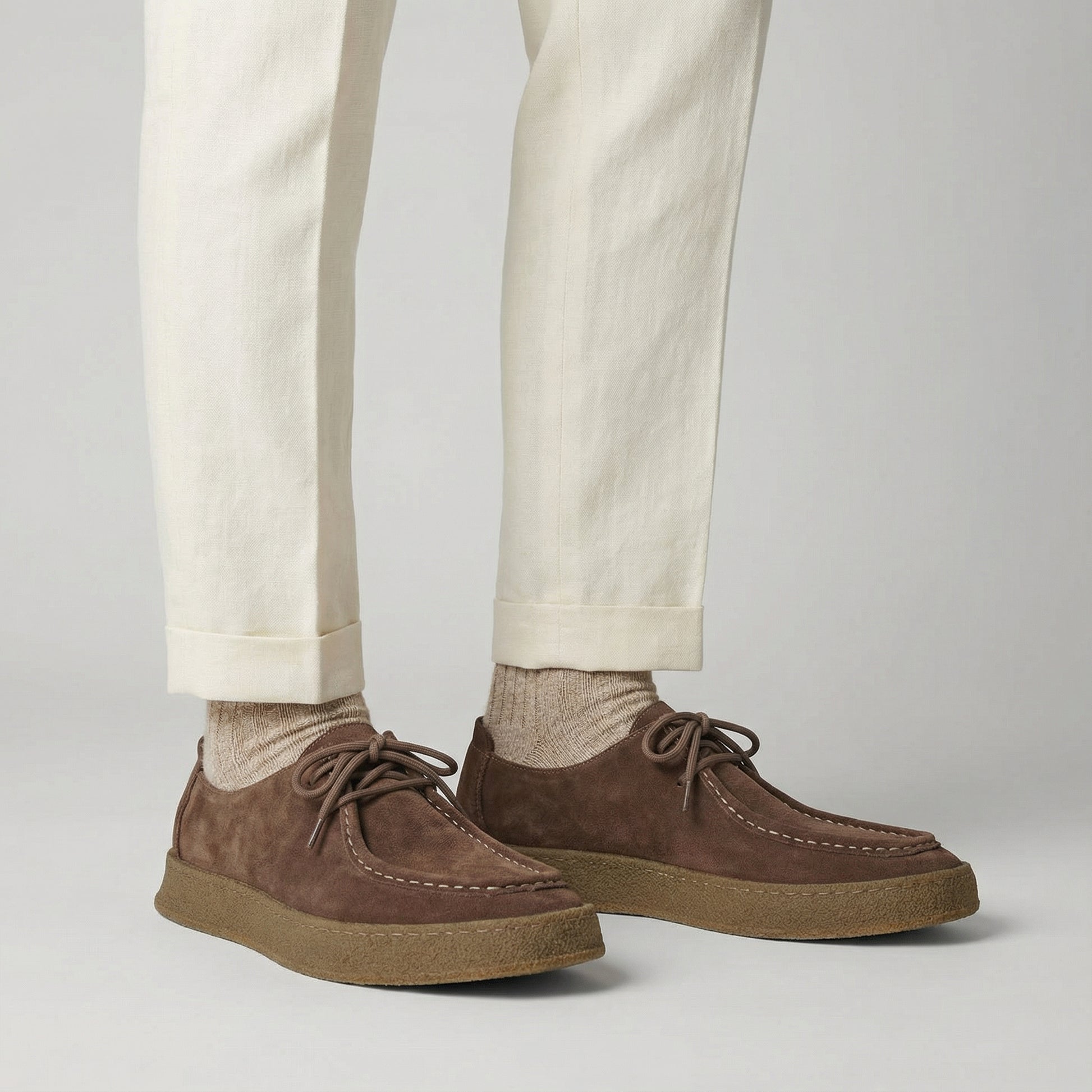 This men’s lace-up shoe features a textured upper with defined moc-toe stitching for a structured, casual appearance. The low-profile shape and layered sole create a balanced visual form. Minimal detailing keeps the design clean and versatile. A considered option for everyday wardrobes with a relaxed urban direction.