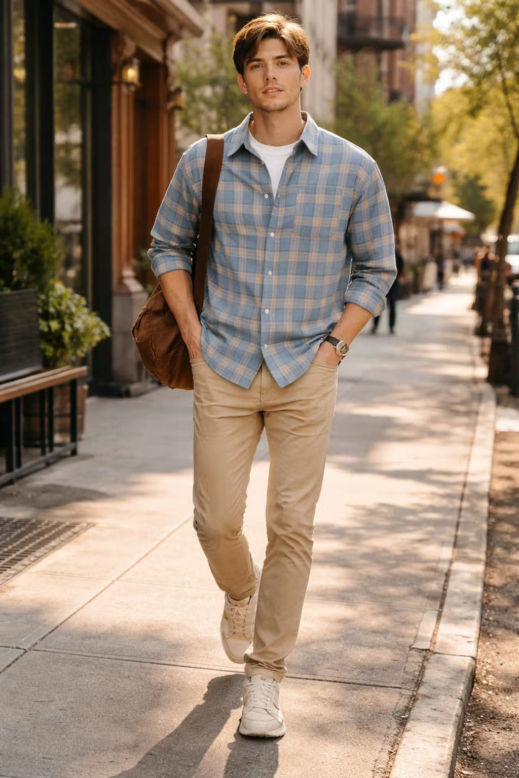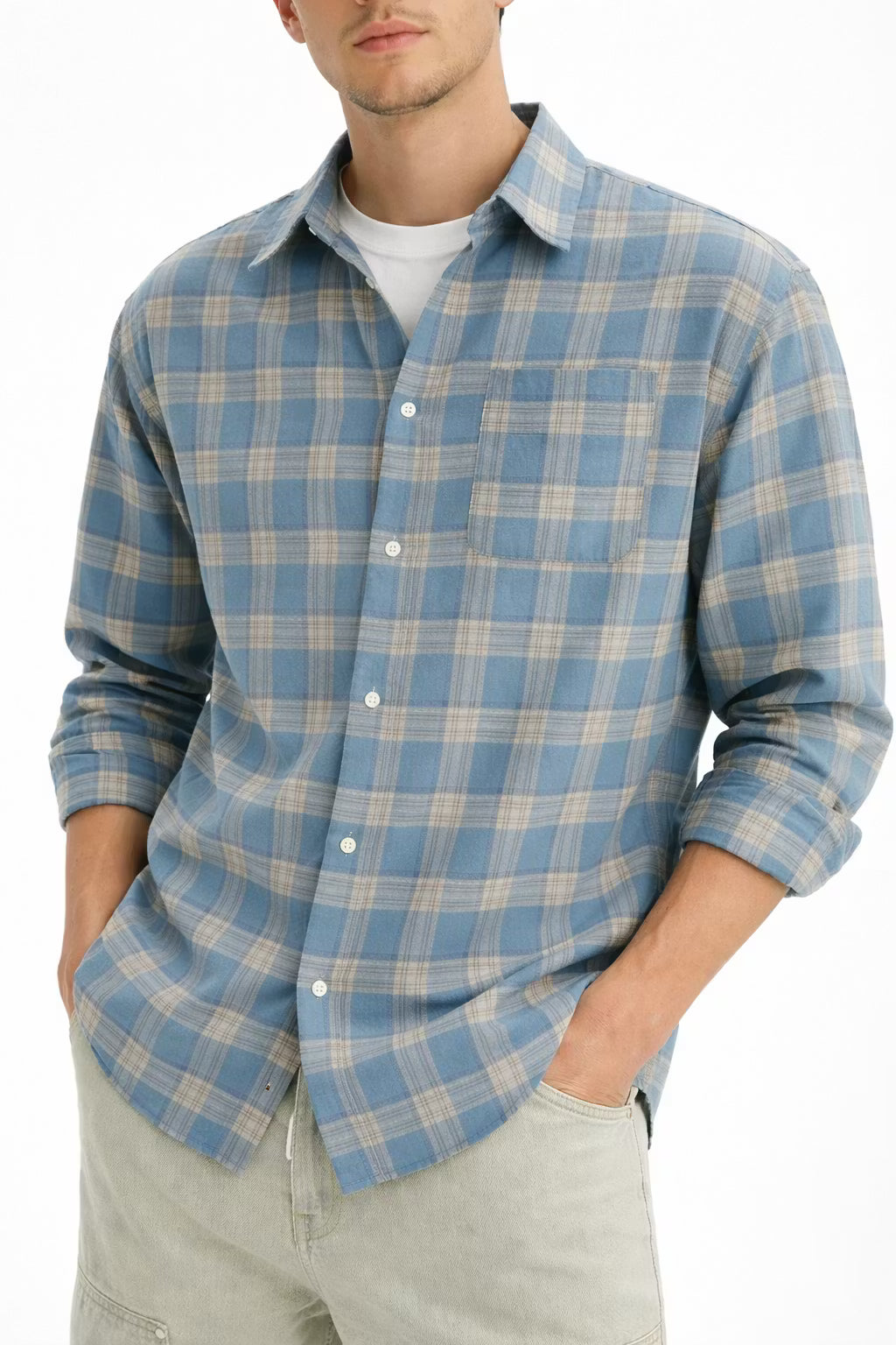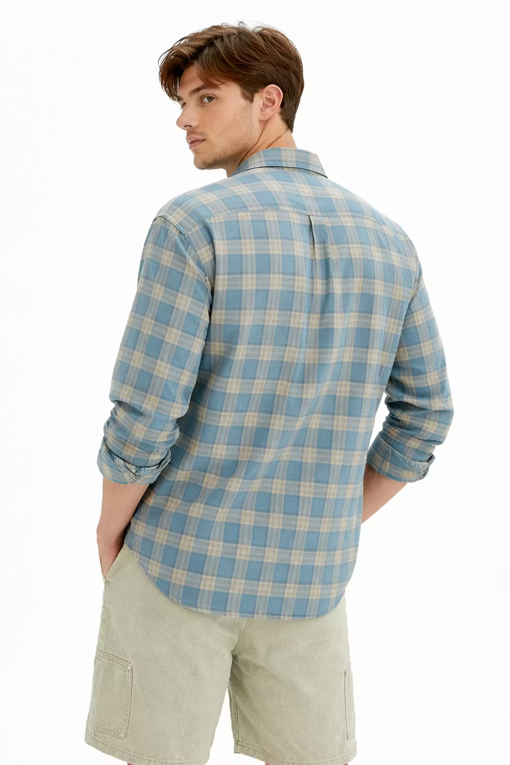 This men’s plaid weave shirt is made from a woven textile that presents a structured surface pattern throughout. The collared neckline and front button closure create a defined silhouette suited for layered styling. Long sleeves add balance to the overall form. Designed for seasonal wardrobes, this shirt pairs naturally with trousers or knit layers.