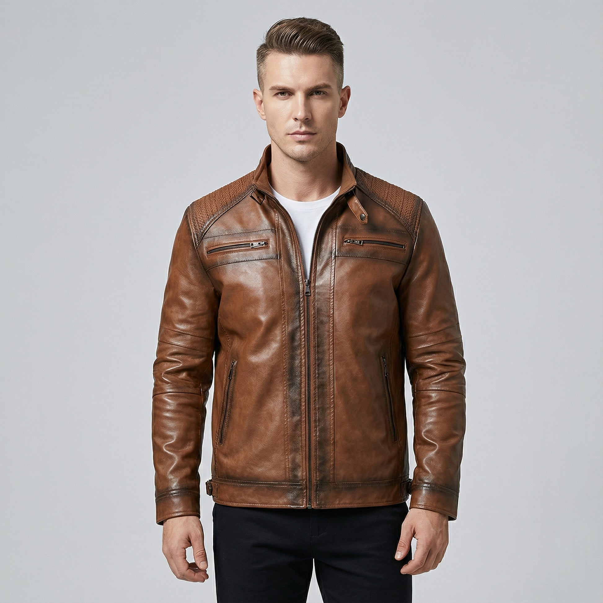Men’s Brown Coated Textile Zip Jacket with Structured Seam Detailing High Collar
