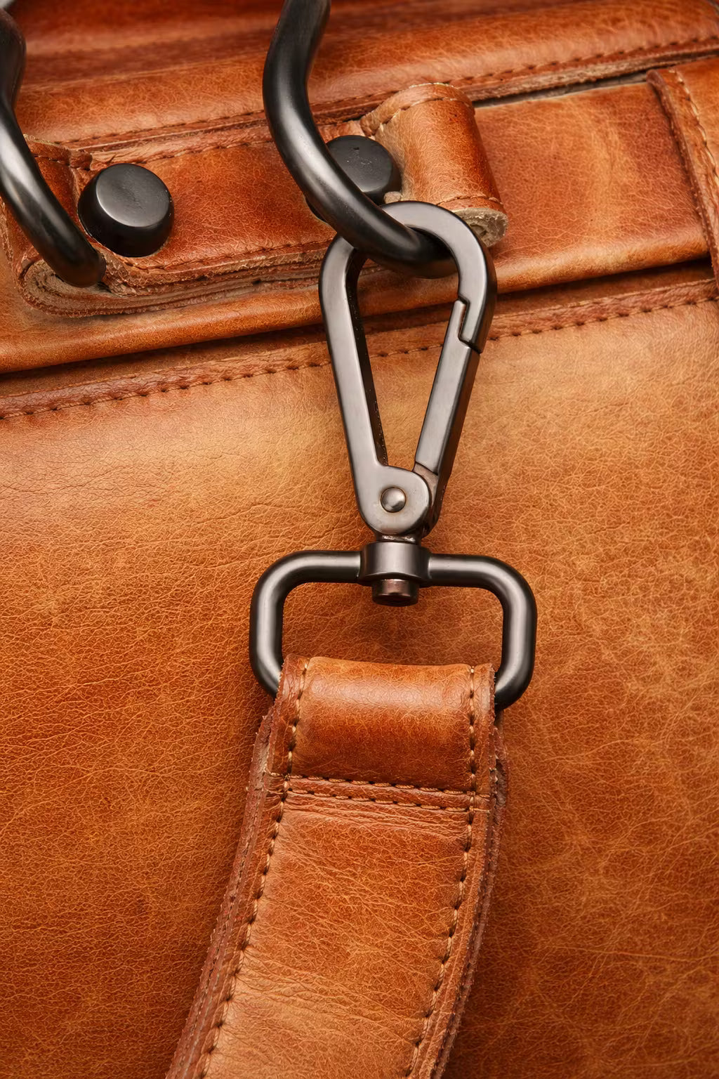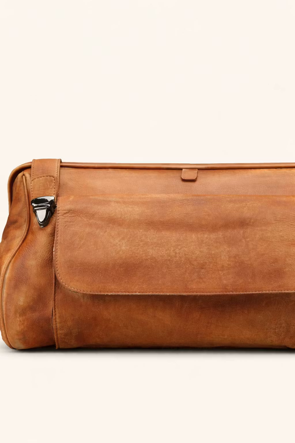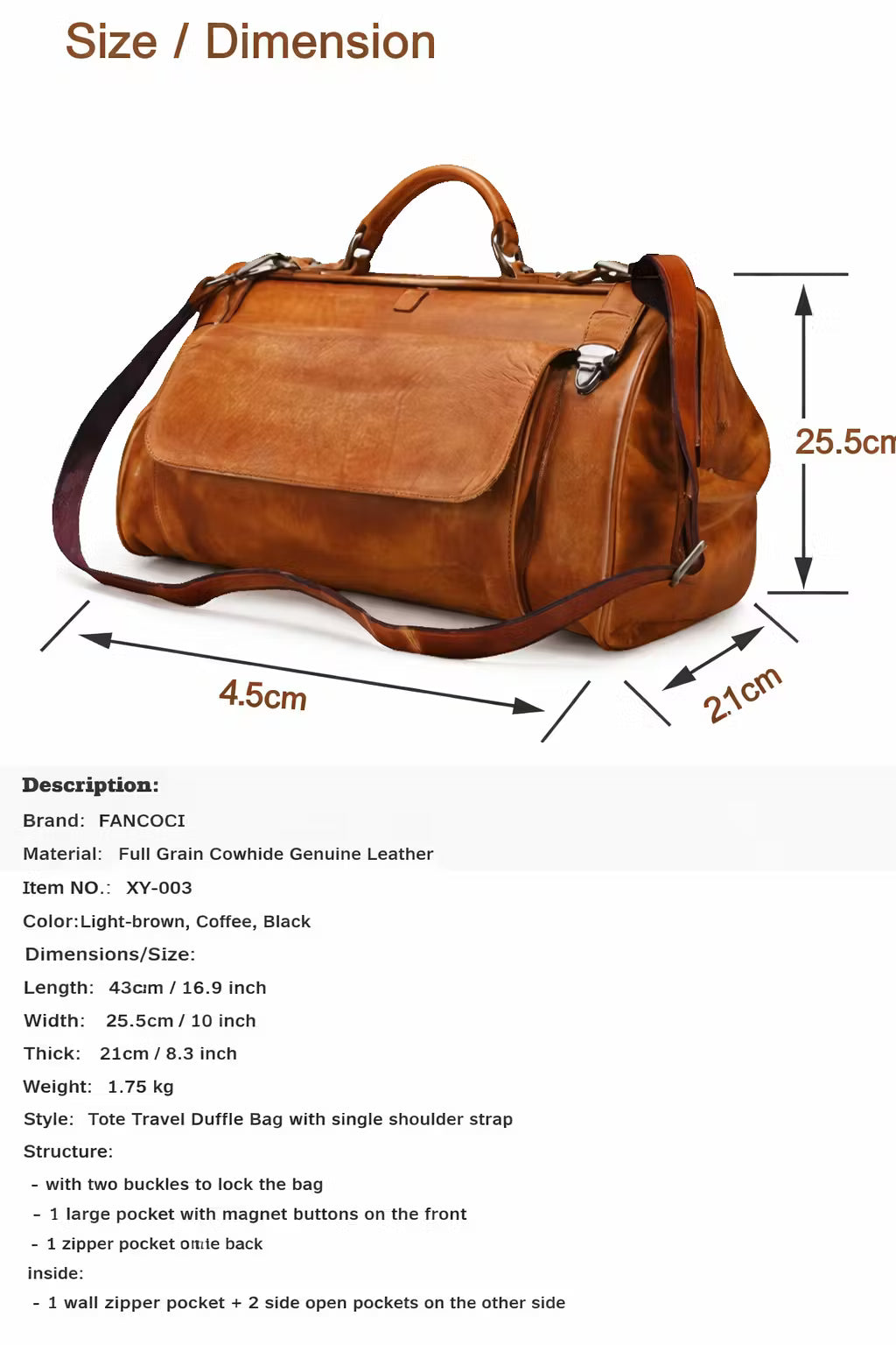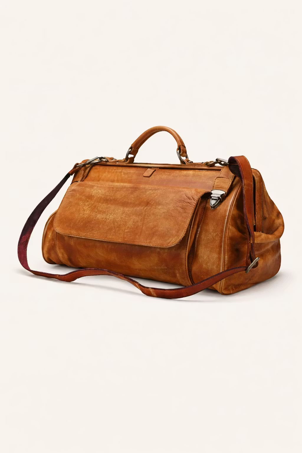 This structured travel duffel bag is crafted from top layer cowhide with a canvas-lined interior for organized packing. The flap design with buckle closure adds a clean front profile while securing stored items. Interior compartments allow separation of essentials such as devices and accessories. Dual handles and a shoulder strap provide flexible carry options. Designed for travel, commuting, and short trips.