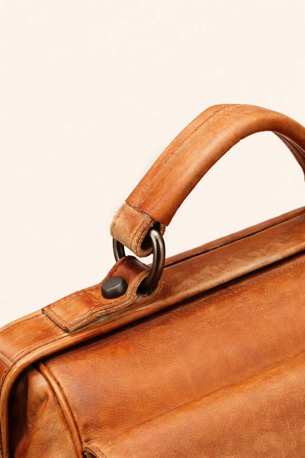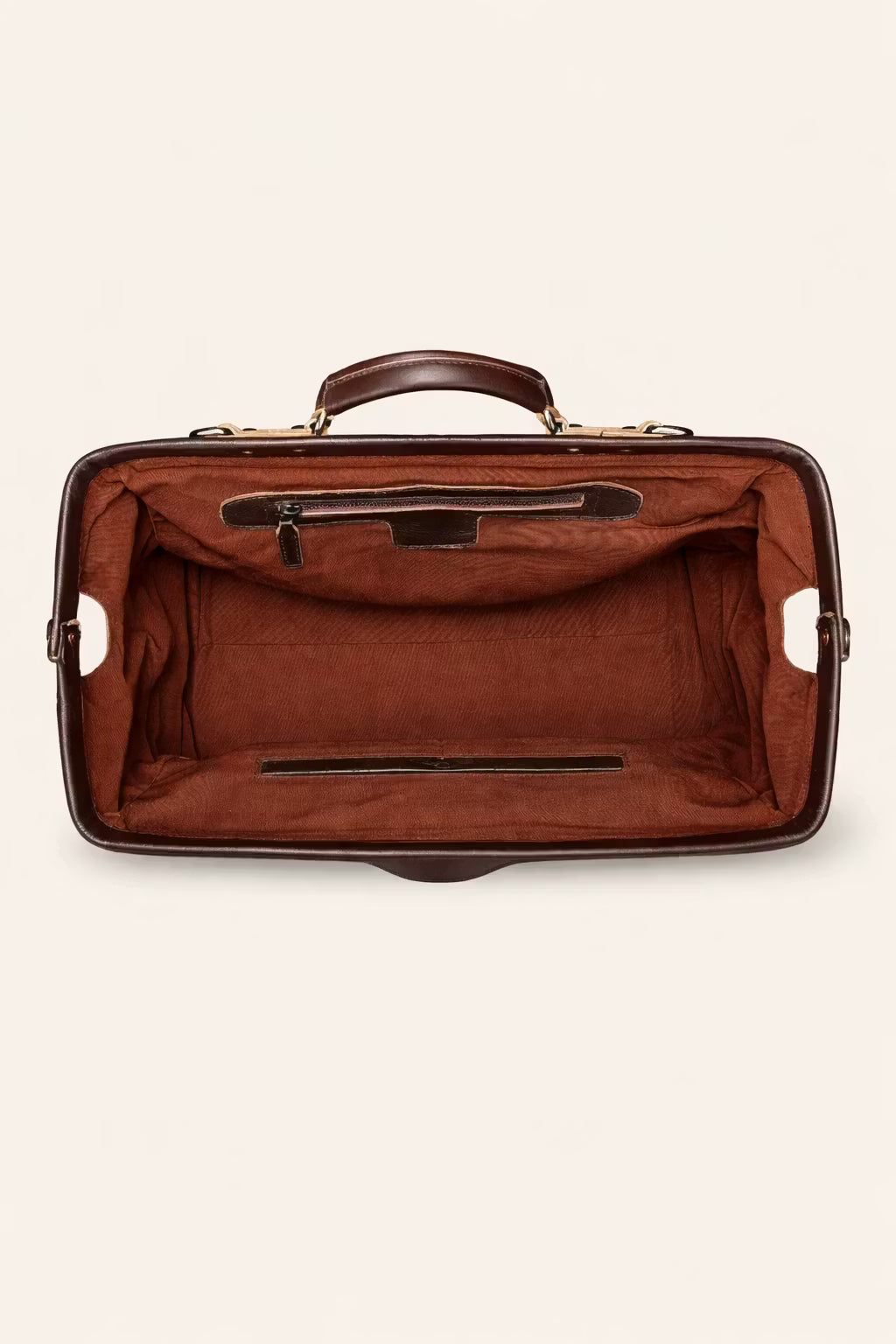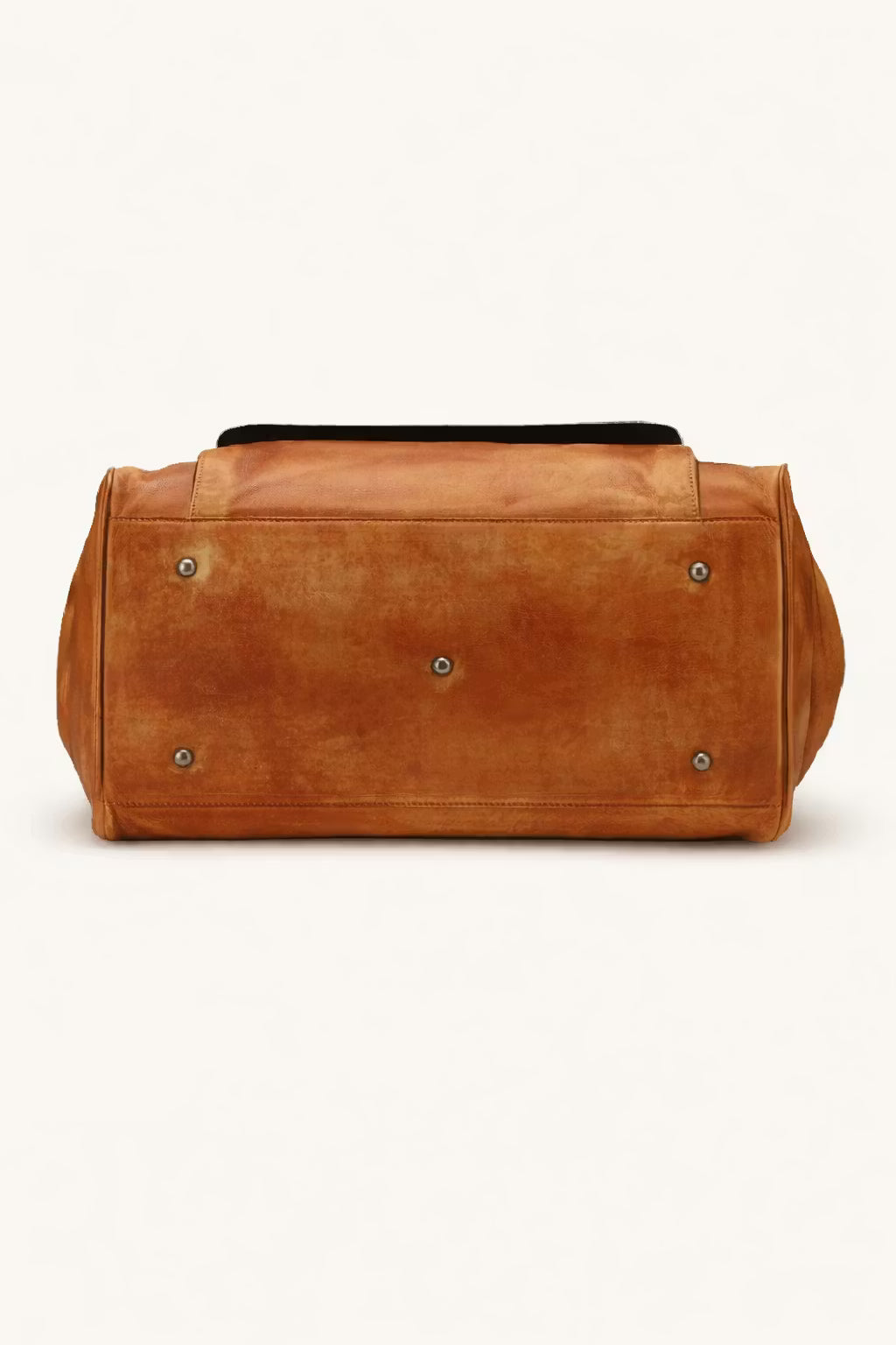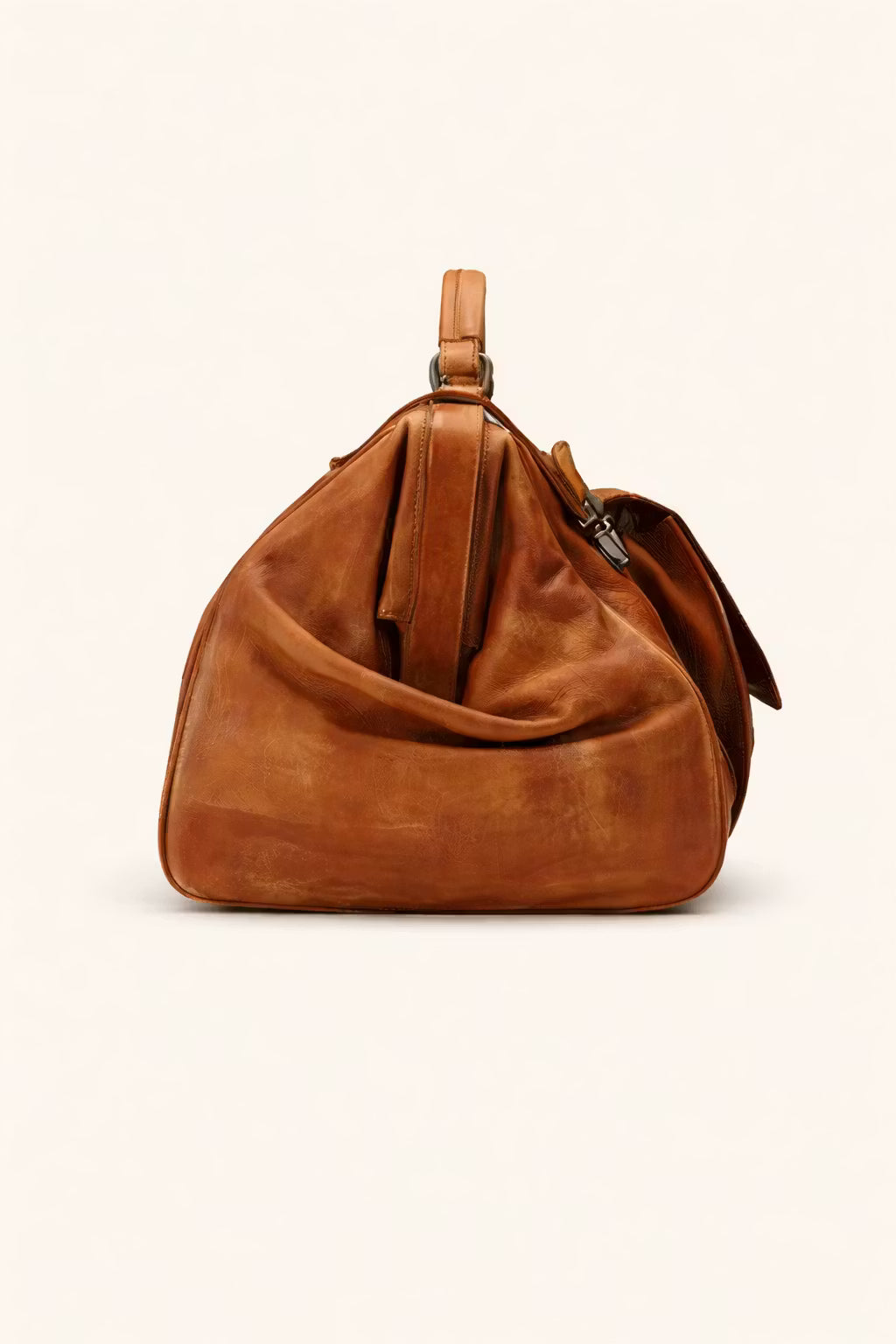 This structured travel duffel bag is crafted from top layer cowhide with a canvas-lined interior for organized packing. The flap design with buckle closure adds a clean front profile while securing stored items. Interior compartments allow separation of essentials such as devices and accessories. Dual handles and a shoulder strap provide flexible carry options. Designed for travel, commuting, and short trips.