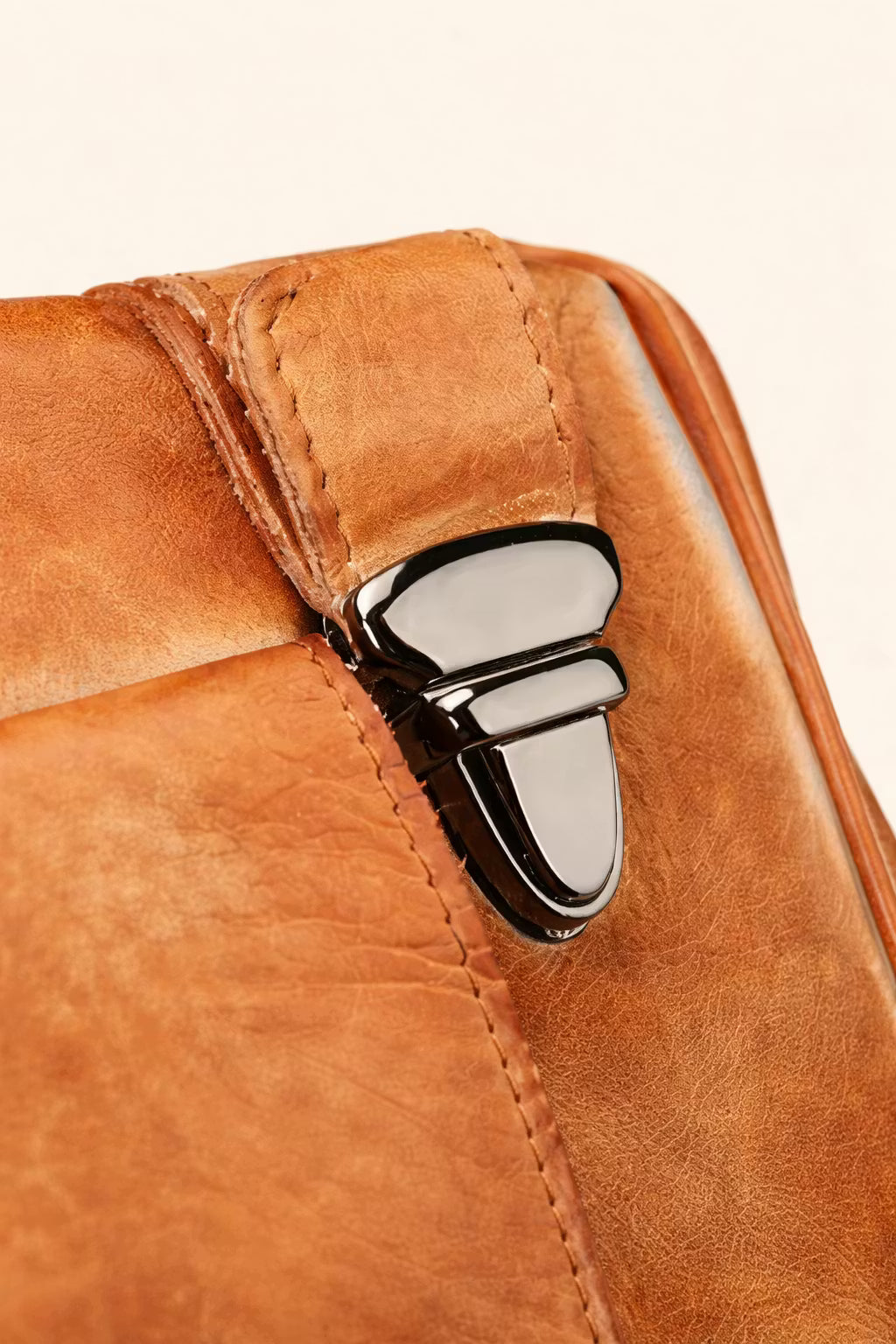 - Structure: flap closure with dual buckles, front magnetic pocket, back zip pocket