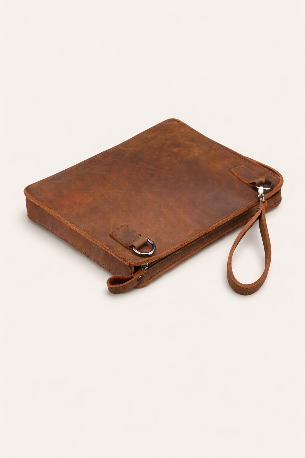 This slim portfolio-style bag is crafted with a refined full-grain surface that develops character over time. The flat structured design allows organized storage for documents, tablets, or small laptops without added bulk. A detachable strap provides flexibility between hand carry and crossbody use. Clean stitching and reinforced hardware create a sharp, professional appearance suited for business environments. Ideal for office use, commuting, and travel. Sized for everyday carry, this bag measures 32 cm in width, 24 cm in height, and 3.5 cm in depth—offering a sleek, structured profile that fits essentials without bulk.