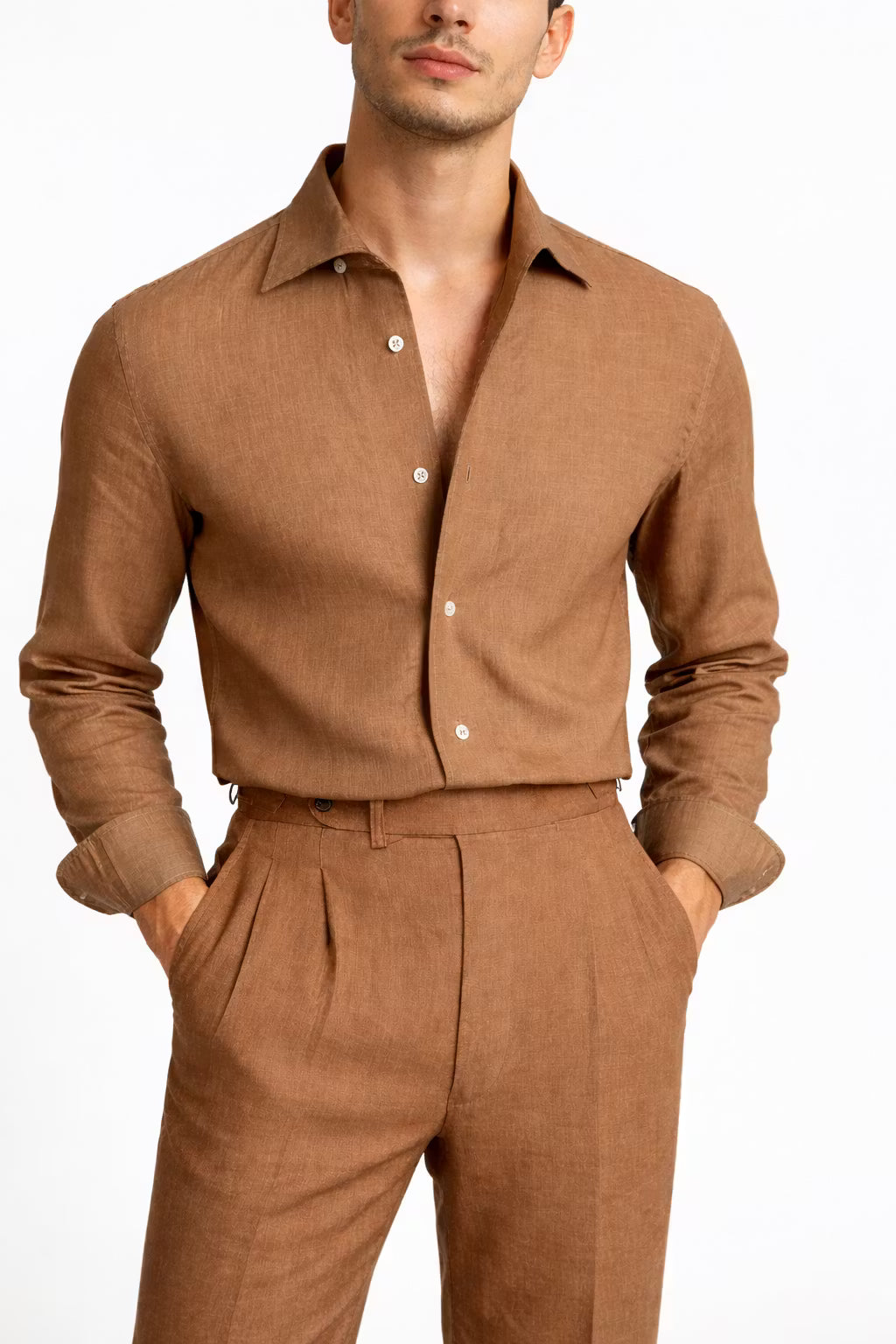 Designed for refined mid-season layering, this linen overshirt delivers a clean, structured silhouette with natural airflow. The linen-cotton blend enhances breathability while maintaining shape, making it ideal for warmer spring days and indoor transitions. Its minimal design allows it to move seamlessly between elevated settings and everyday wear. Built for cost-per-wear, this piece anchors a modern, adaptable wardrobe.