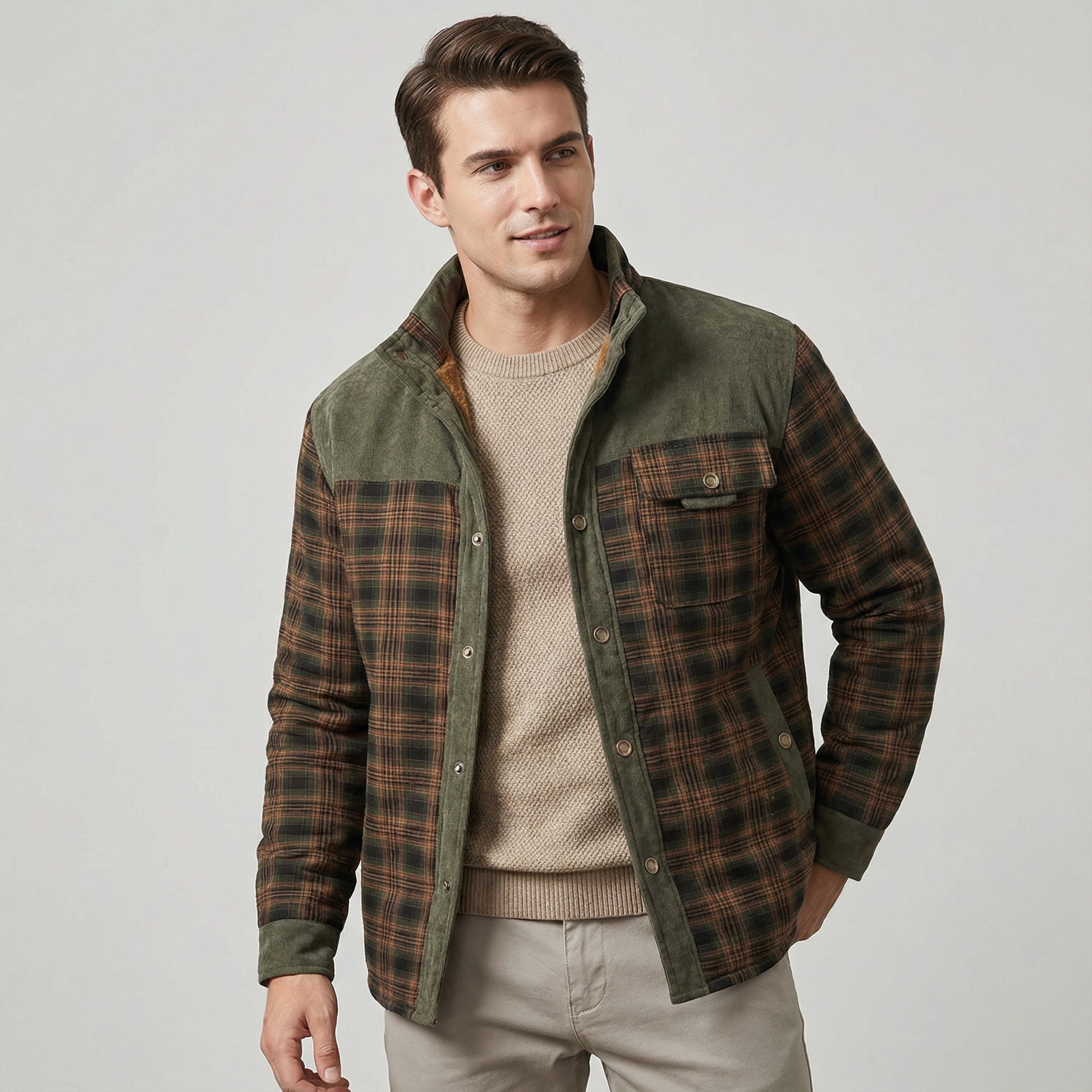 This men’s lined plaid shirt jacket is crafted from a woven textile that presents a structured surface pattern throughout. The collared neckline and snap front closure define the garment’s outer form while maintaining a balanced silhouette. Long sleeves and interior lining add visual depth suitable for seasonal layering. Designed for modern wardrobes, this piece pairs naturally with knitwear or casual bottoms.